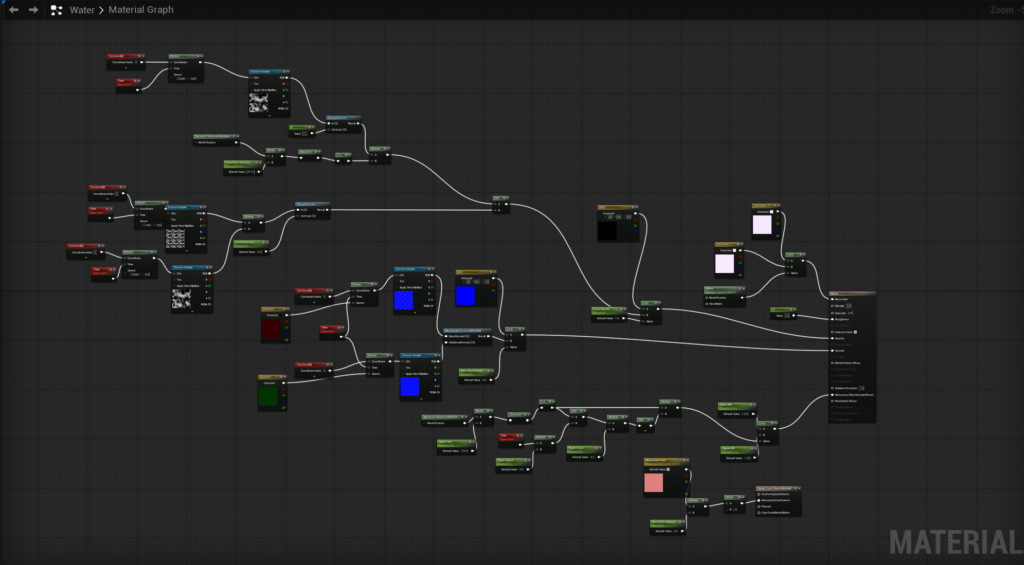 The water material controls surface movement and depth, while a separate waterfall material creates the falling water effect to add motion