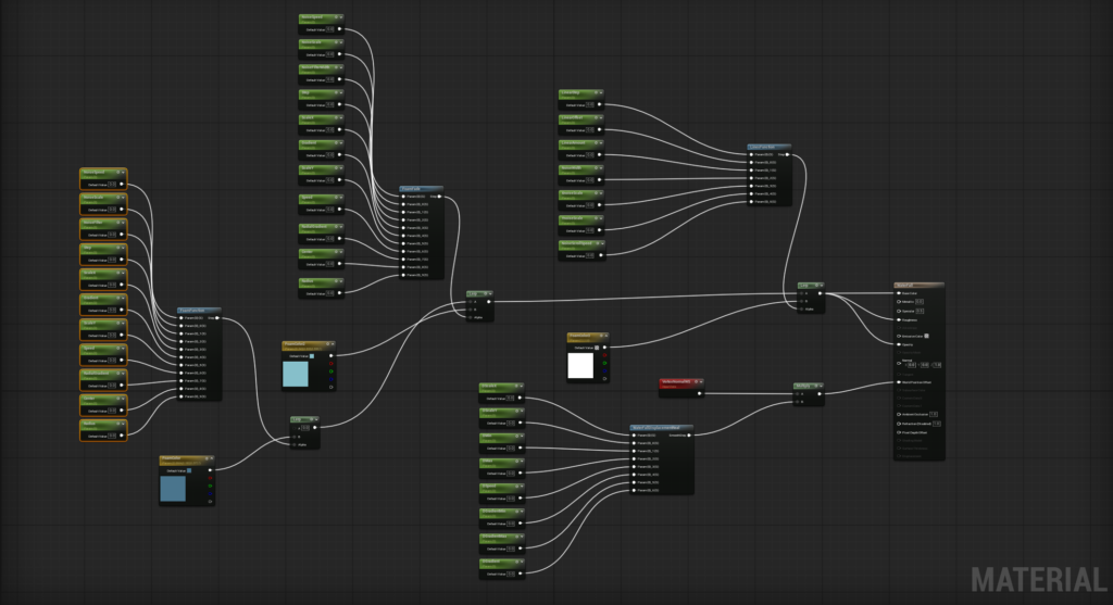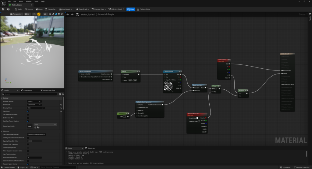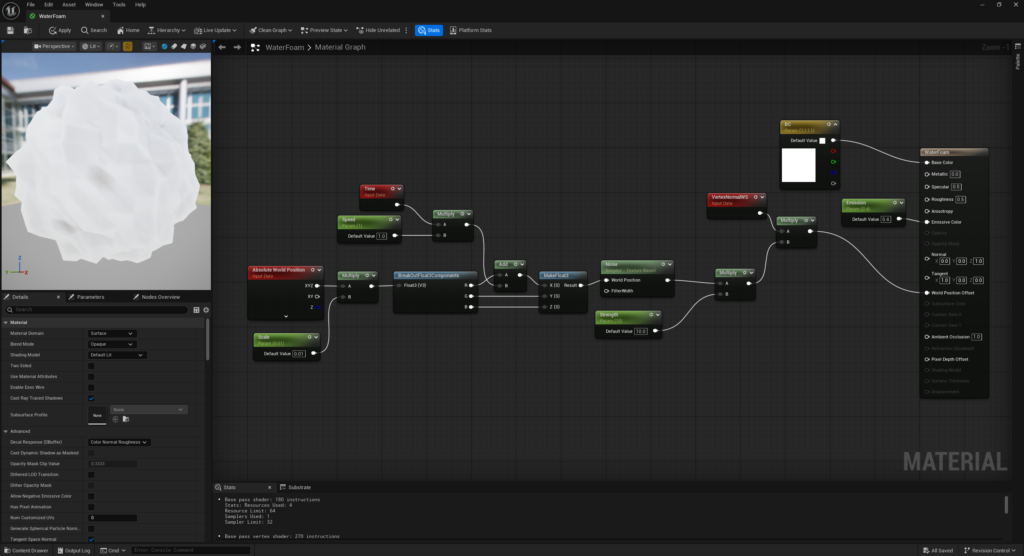 The ripple effect was created using a custom material setup and applied through the particle emitter to simulate water surface interaction. A separate foam material was developed to give selected meshes a soft water-edge appearance, enhancing shoreline and waterfall transitions.