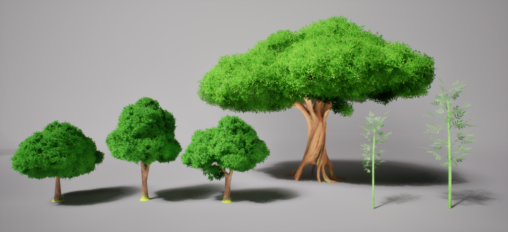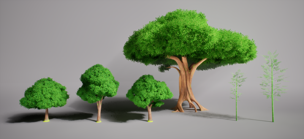 The leaves were created in Blender using the Data Transfer modifier to maintain smooth shading while keeping the geometry lightweight. This helped achieve a clean stylized look while remaining efficient for gameplay use.