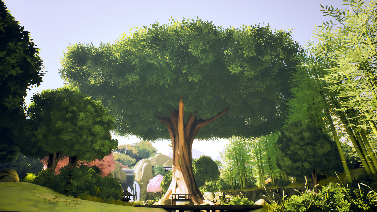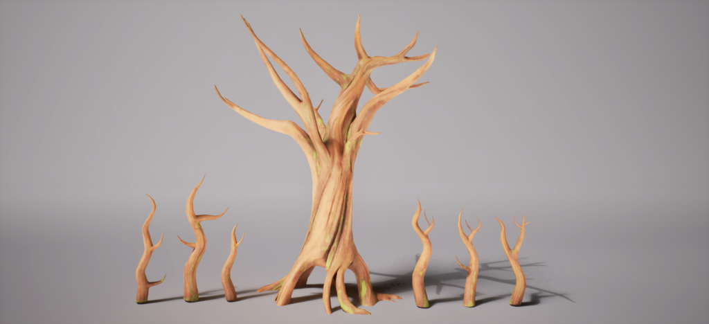 The massive tree at the center acts as the main focal point of the environment. It was developed from concept by group member to final asset, with a strong focus on silhouette and stylized shape to support the overall composition of the level.